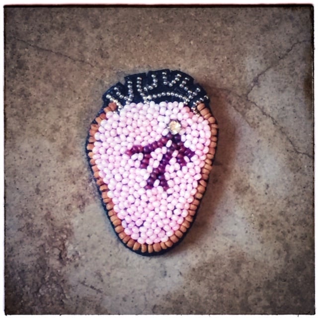 A one-of-a-kind pin, made of salvaged leather, hand-embroidered with vintage glass & wooden beads... this pearly pink anatomical heart brooch is mounted on a stainless steel pin, made in France.